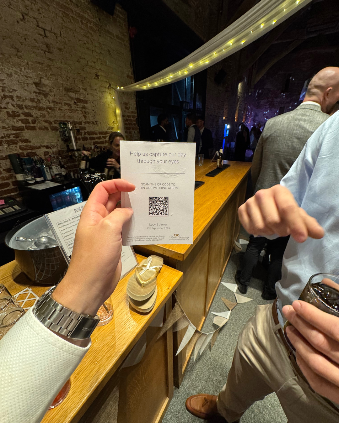 Place your QR code tent cards around your venue in all the photo hot spots and let guests take photos, scan your QR code and upload them instantly to your private gallery. Guests can still upload after your wedding day.